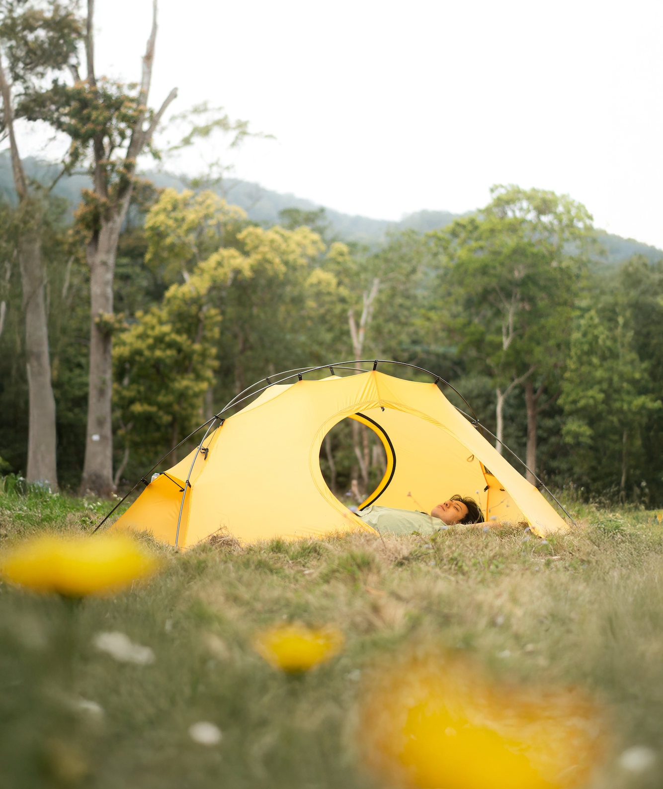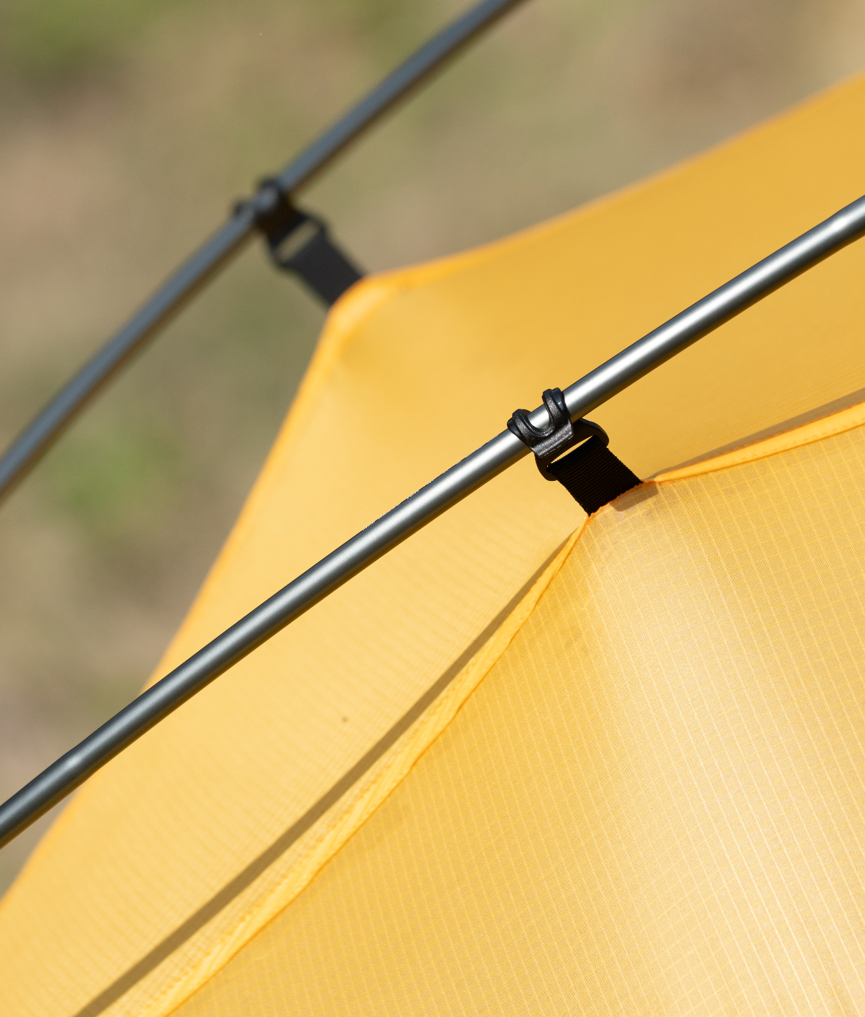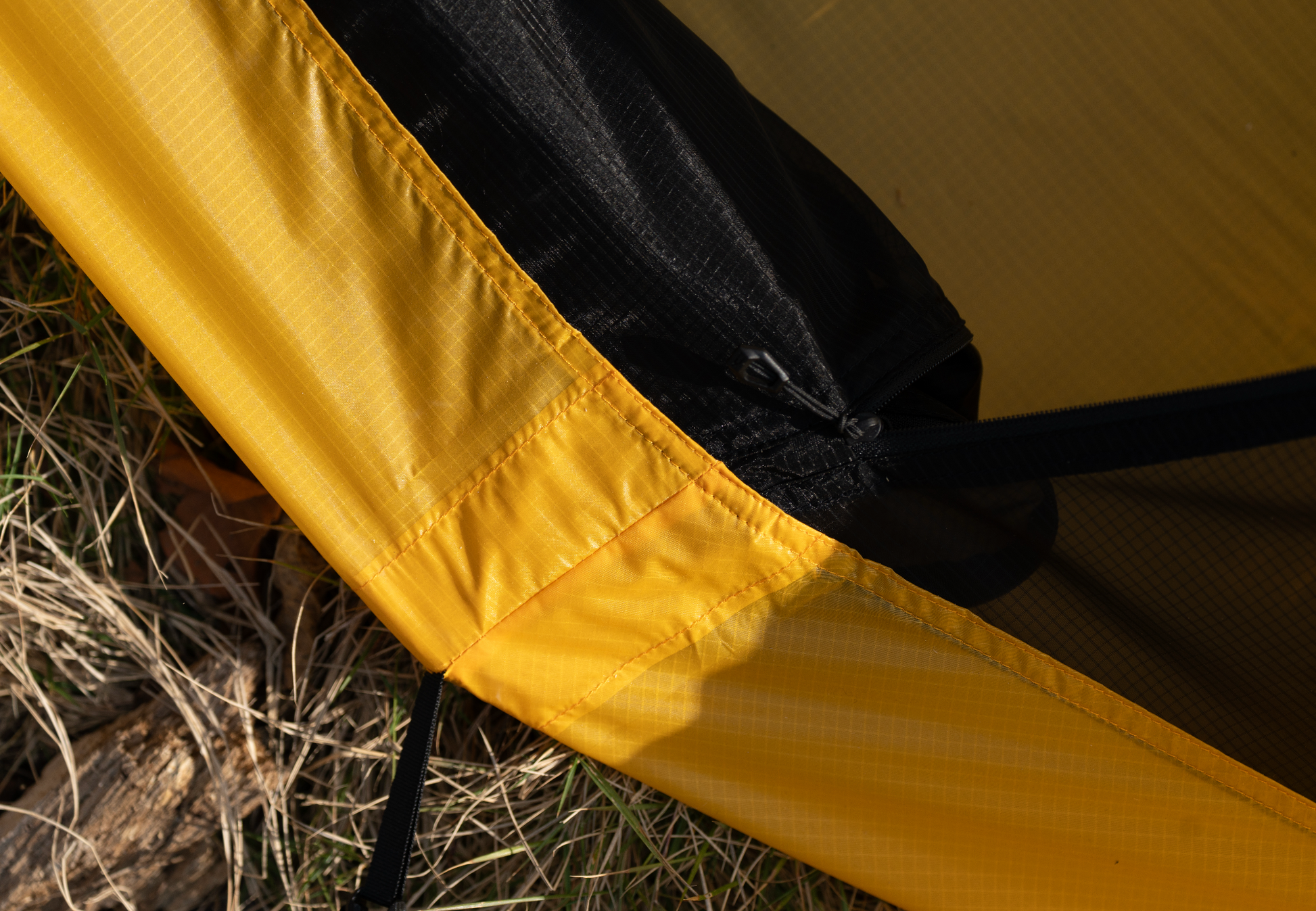 在選色上,我們選擇了黃色及黑色 ,黃色是一隻在大自然環境中不違和且舒適的顏色,在照片中黃色帳篷也是比較特出卻不突兀的存在。配搭黑色DAC營骨,黑色扣,黑色monofila內帳,黃色底布,銀色DAC釘。